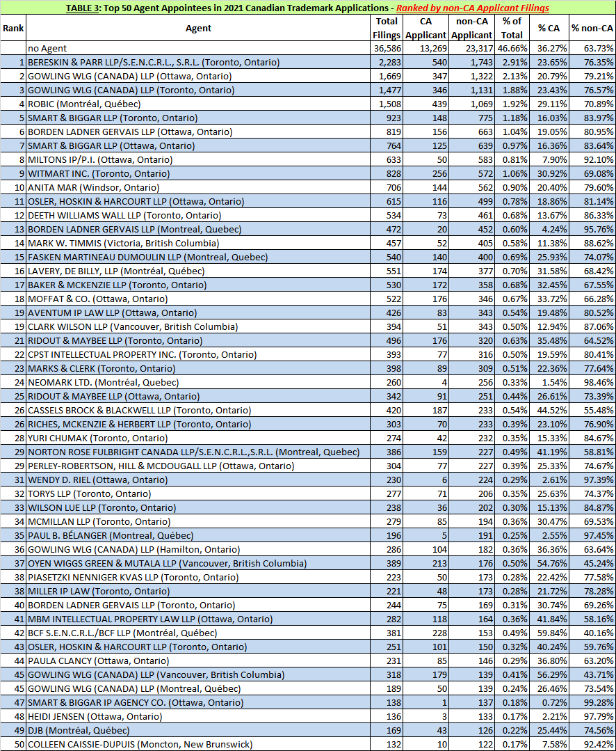2 The dataset reflects CIPO’s trademark .xml data as of 31-Dec-2021. Note that filings per se are not tracked; rather, current appointments of agents are tracked as of 31-Dec-2021. For example, if an application filed in 2021 initially appointed agent A, and if agent A’s appointment was revoked, with agent B being subsequently appointed in 2021 to continue prosecution of the application, then that application is counted only in respect of the currently appointed agent B.↩